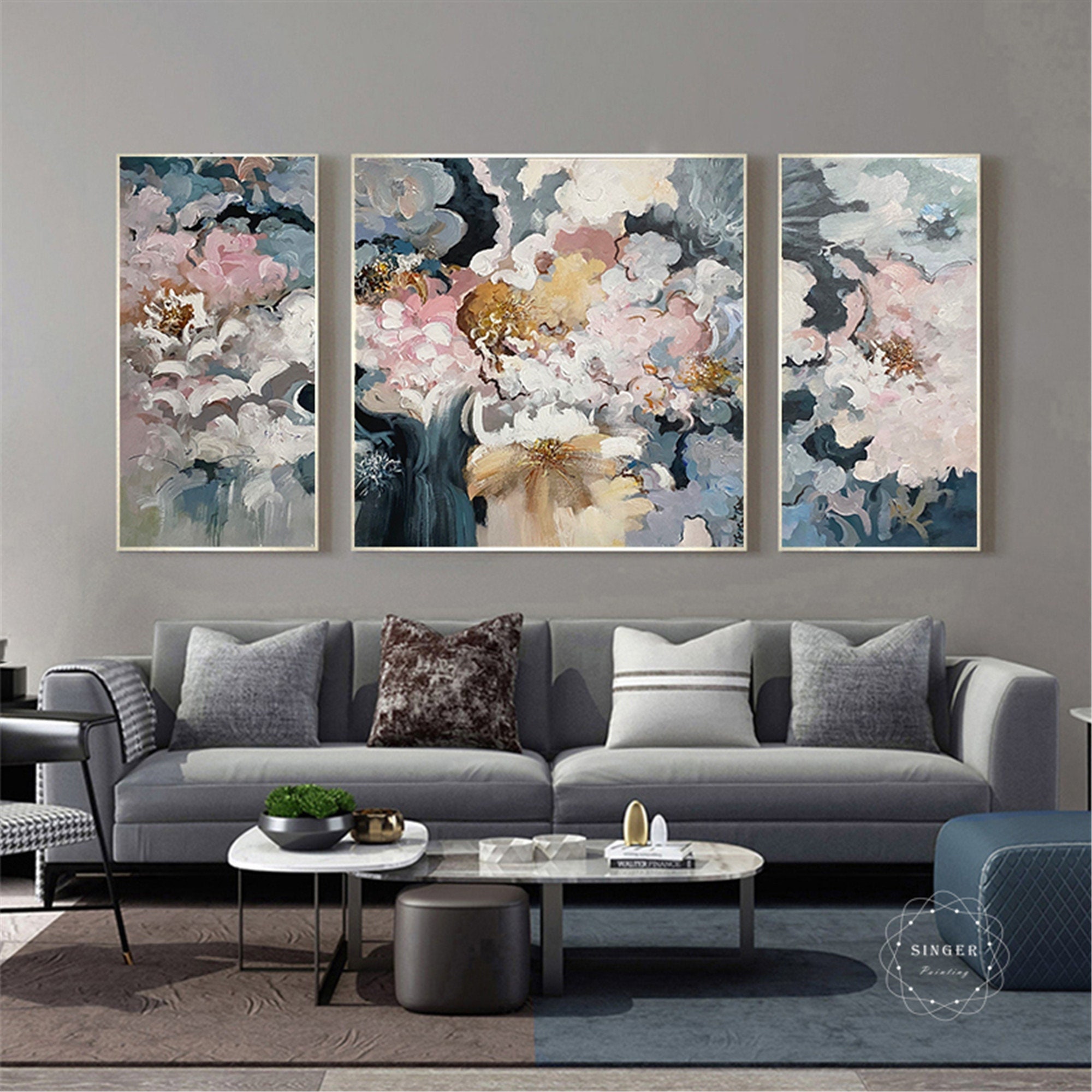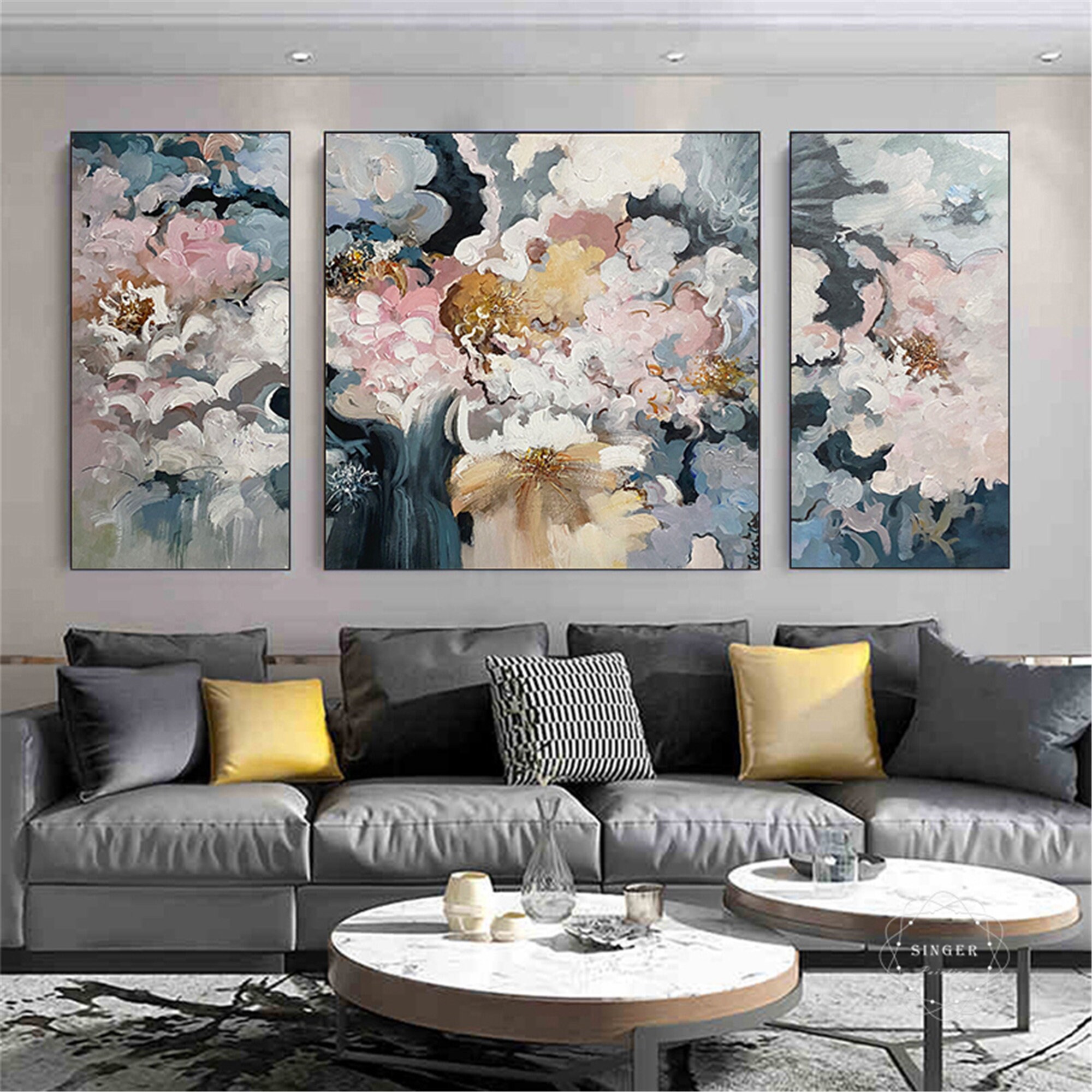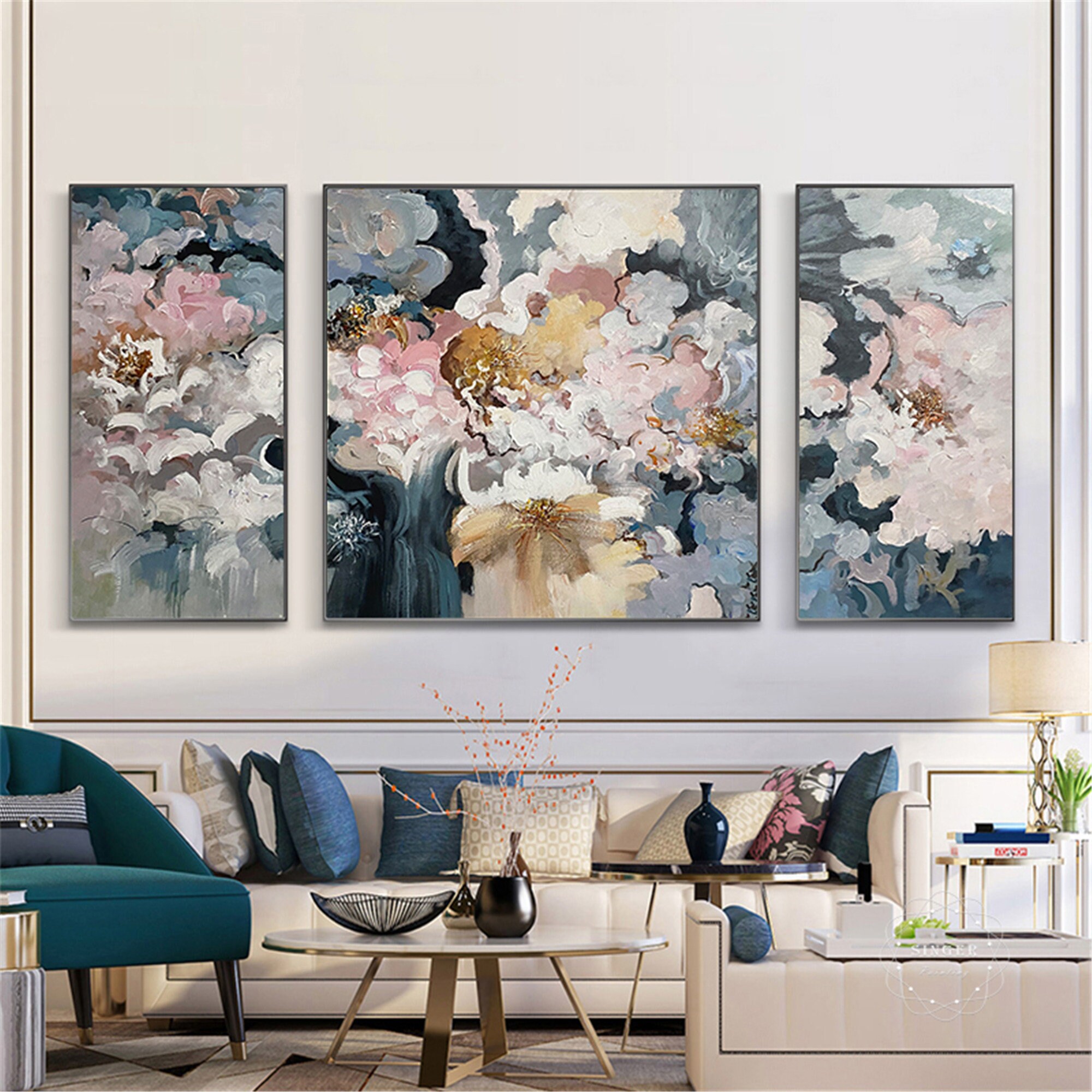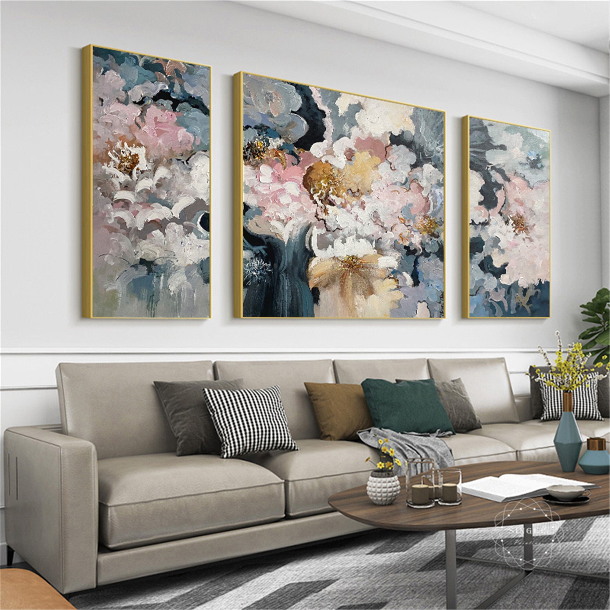 Original flower wall art,3 pieces acrylic Painting on Canvas,abstract pink large painting,personalized gift,framed Living Room wall decor
