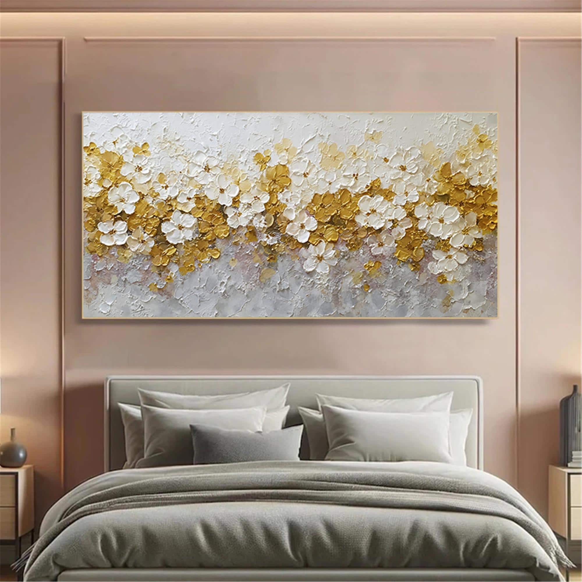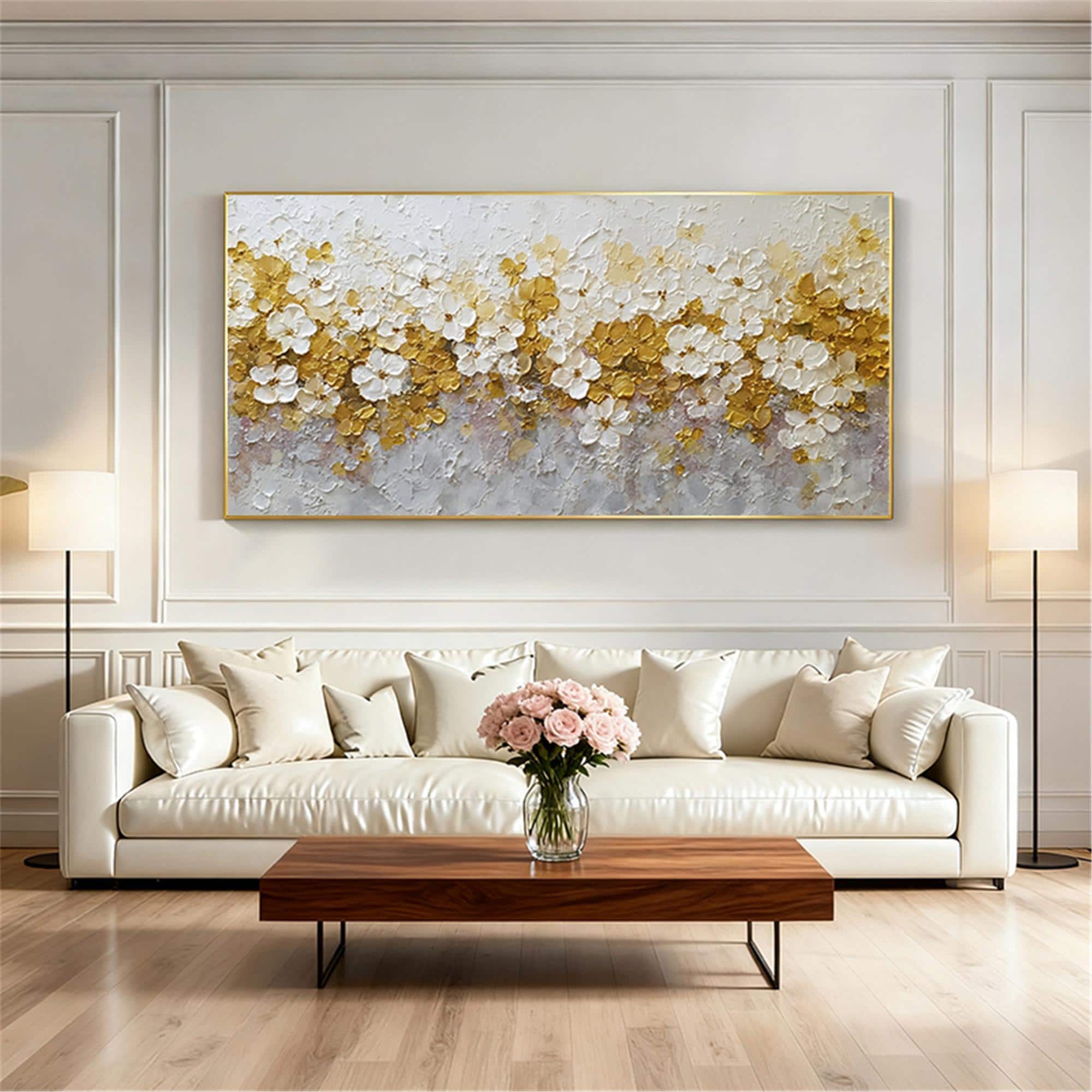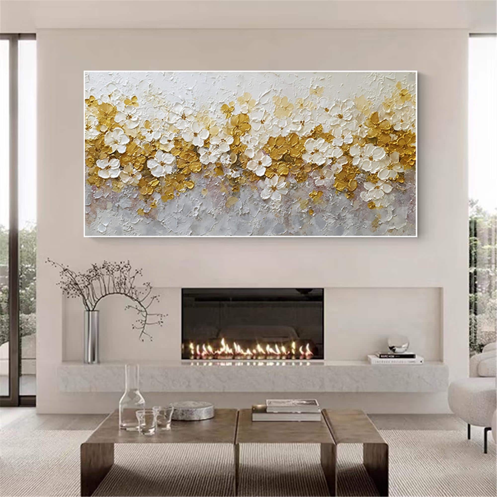 Neutral Spring Floral Wall Art, Handmade Textured Flower Canvas, Beige gold Palette Knife Painting