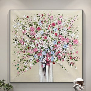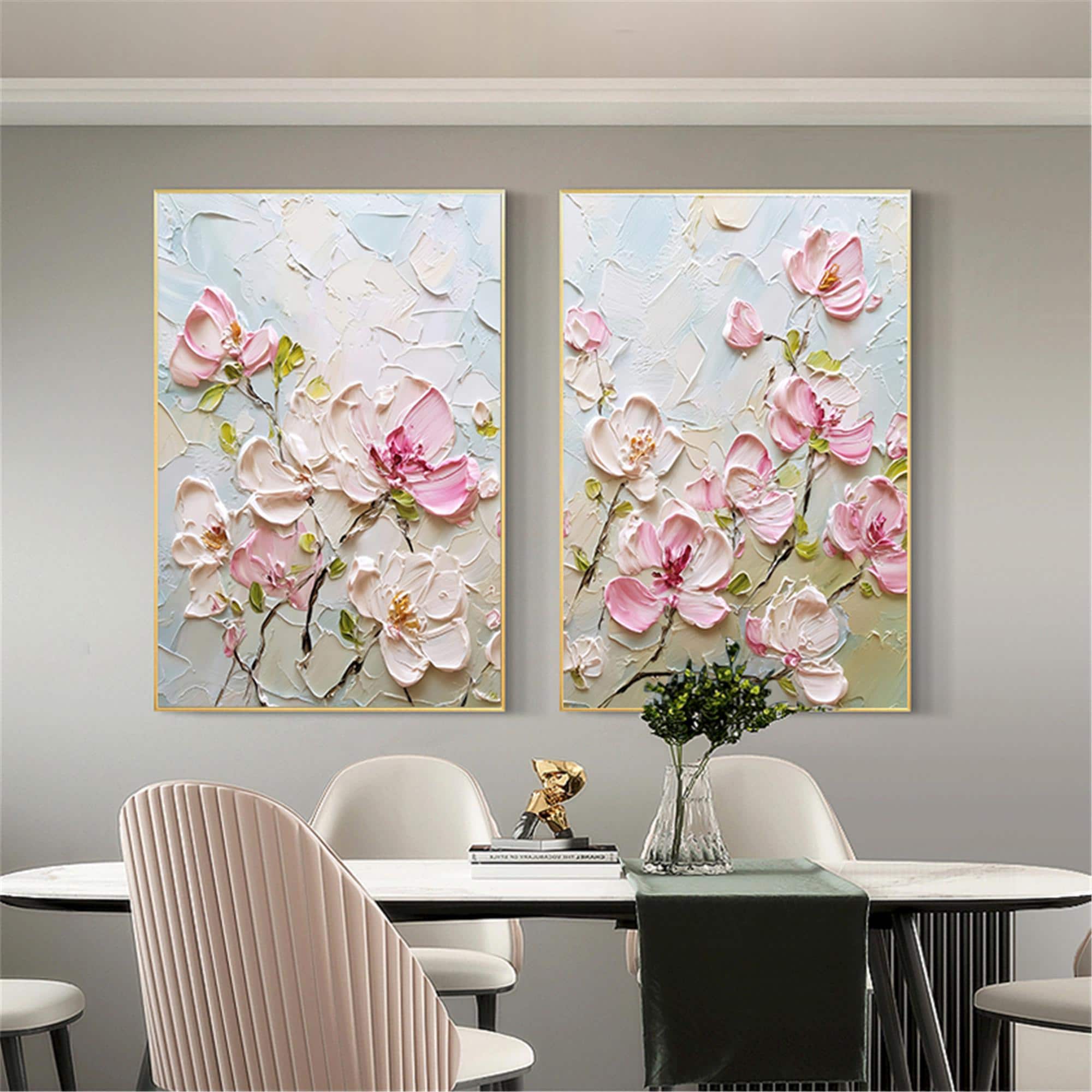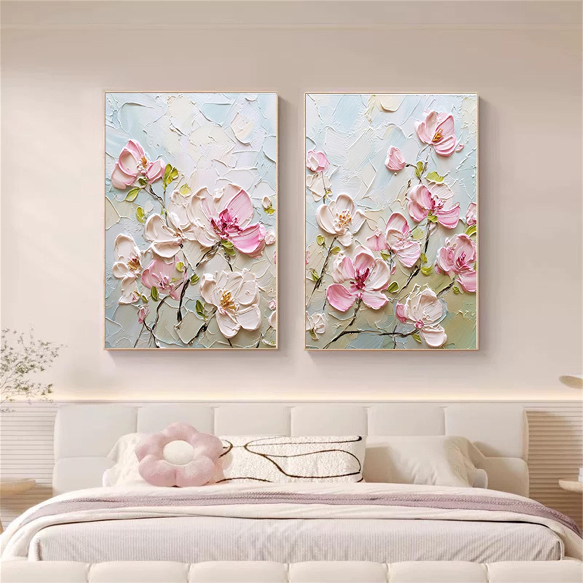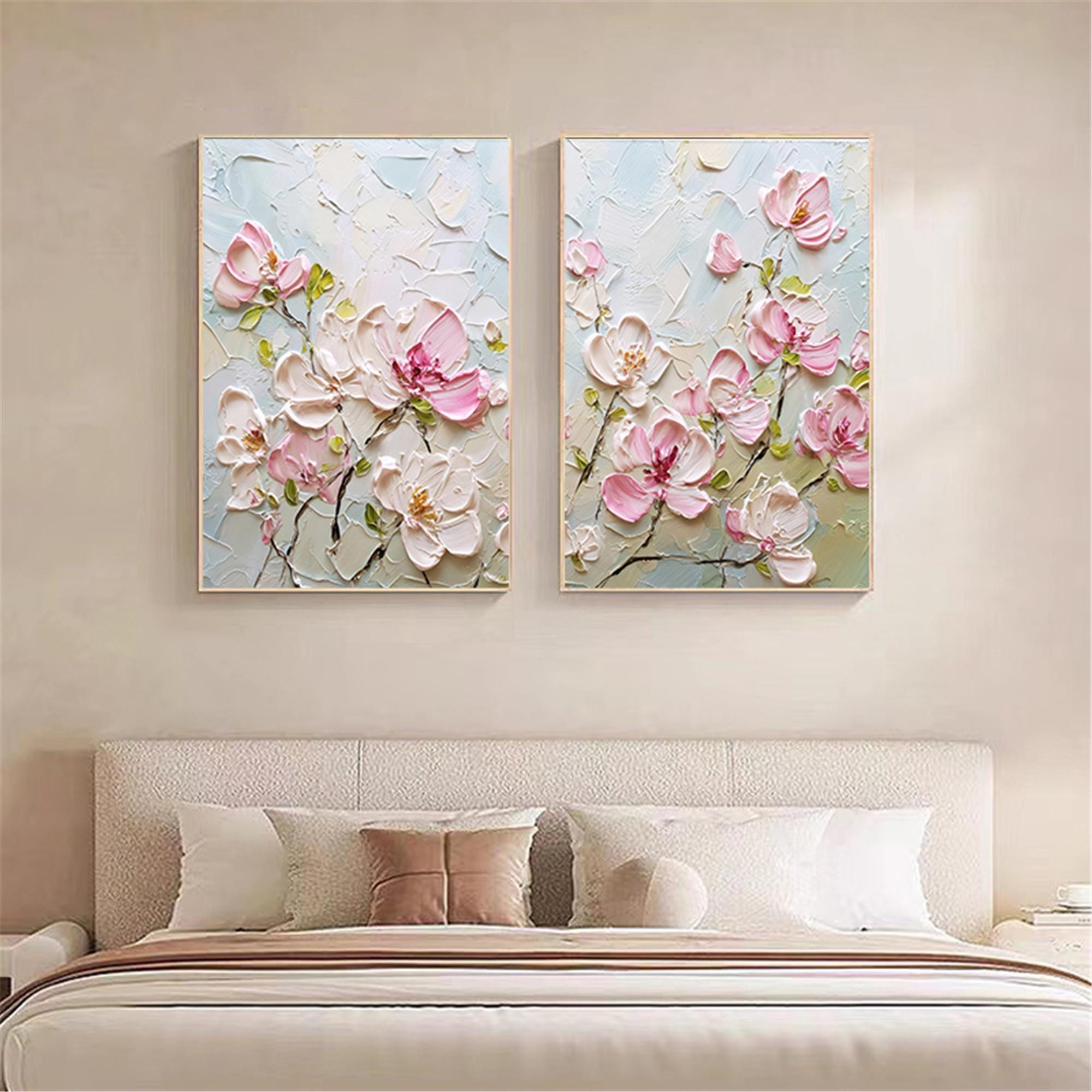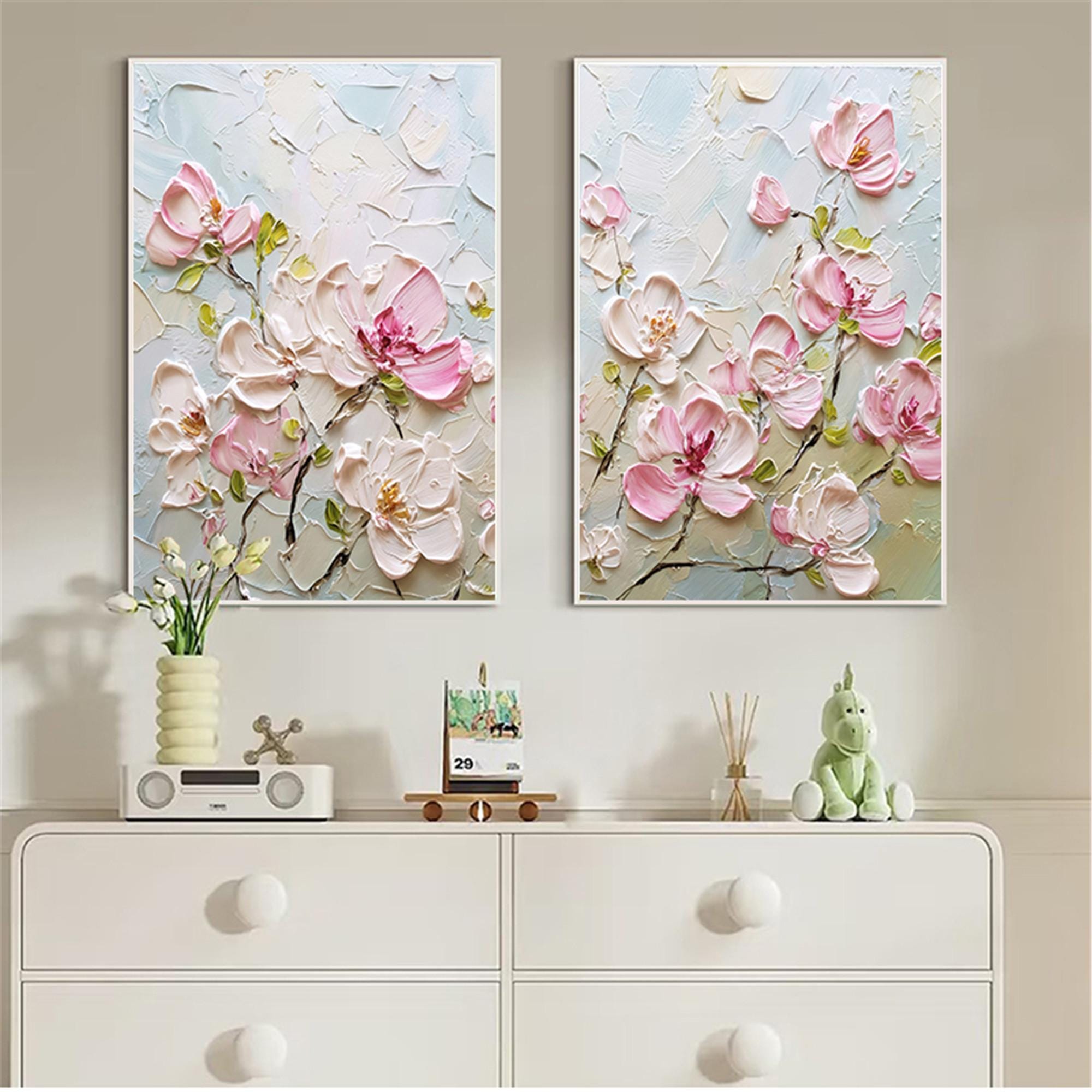 2set acrylic painting on canvas Floral wall art,Pink Oriental Cherry Blossom home decor
