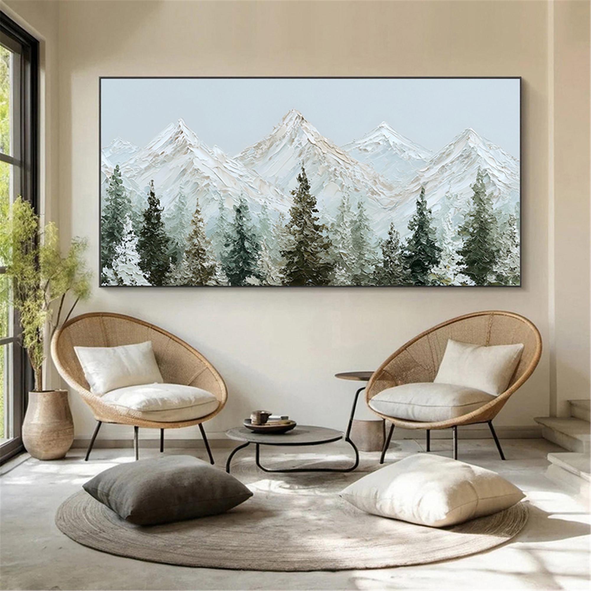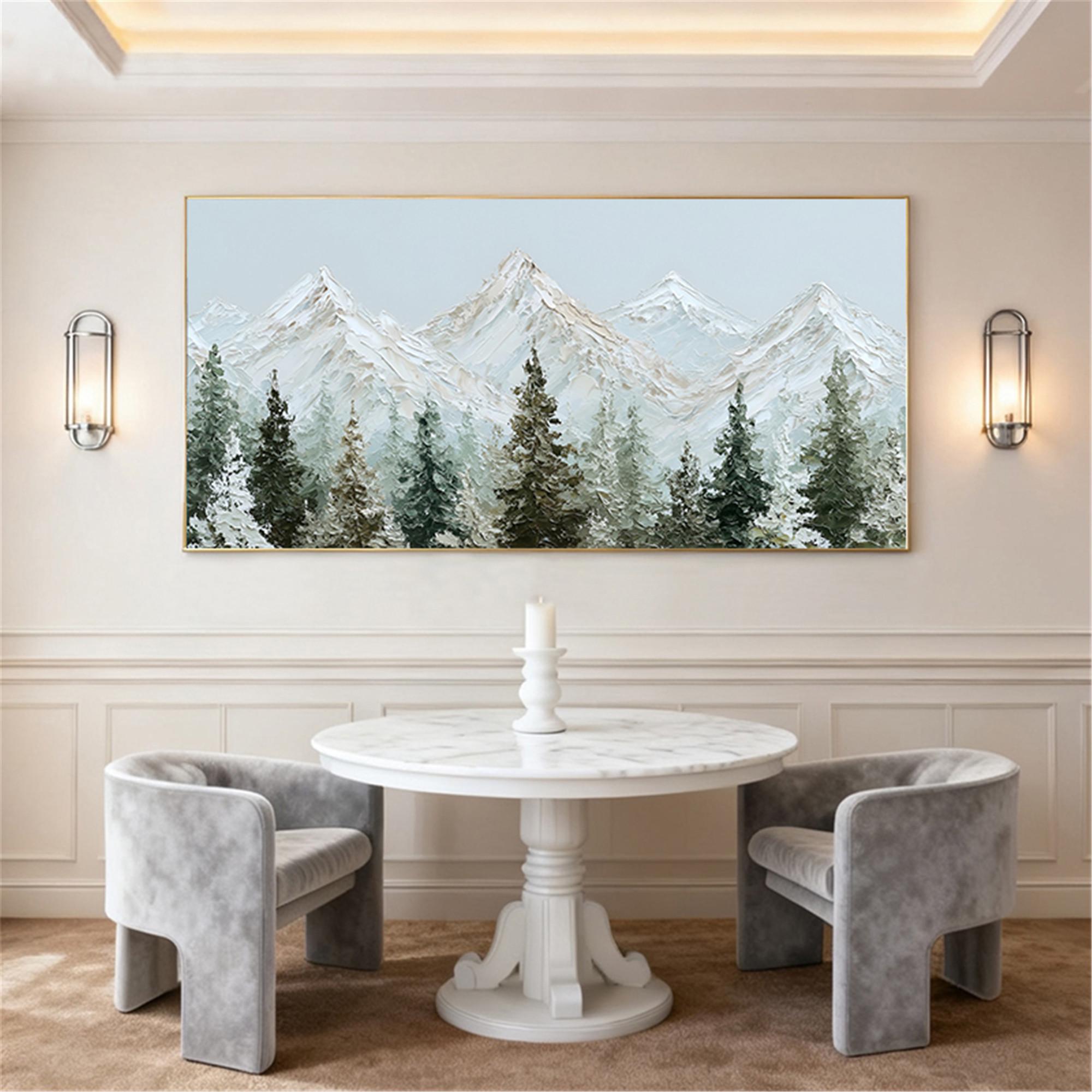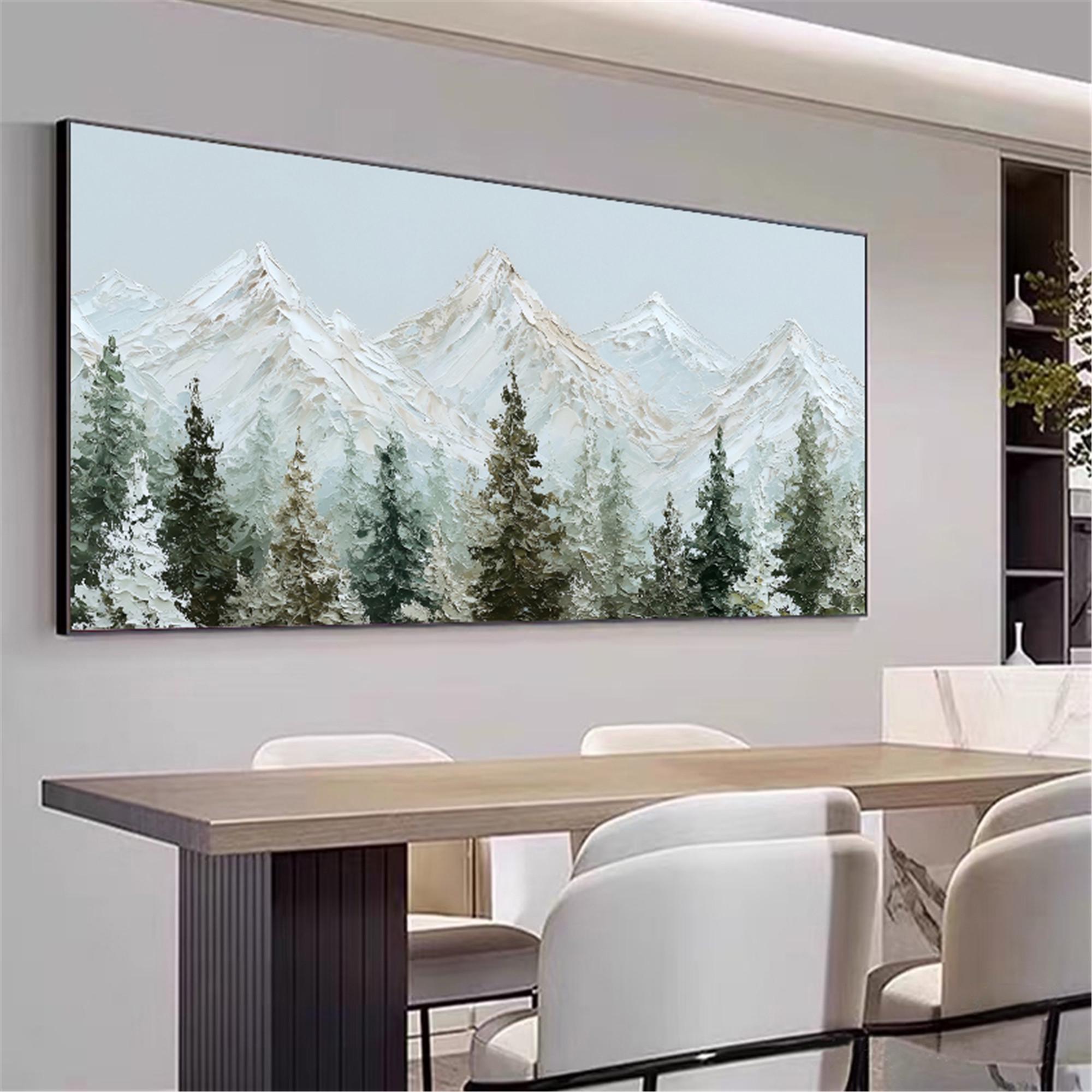 3DTextured green Forest Painting on Canvas,living room wall art,Abstract snow mountain decor