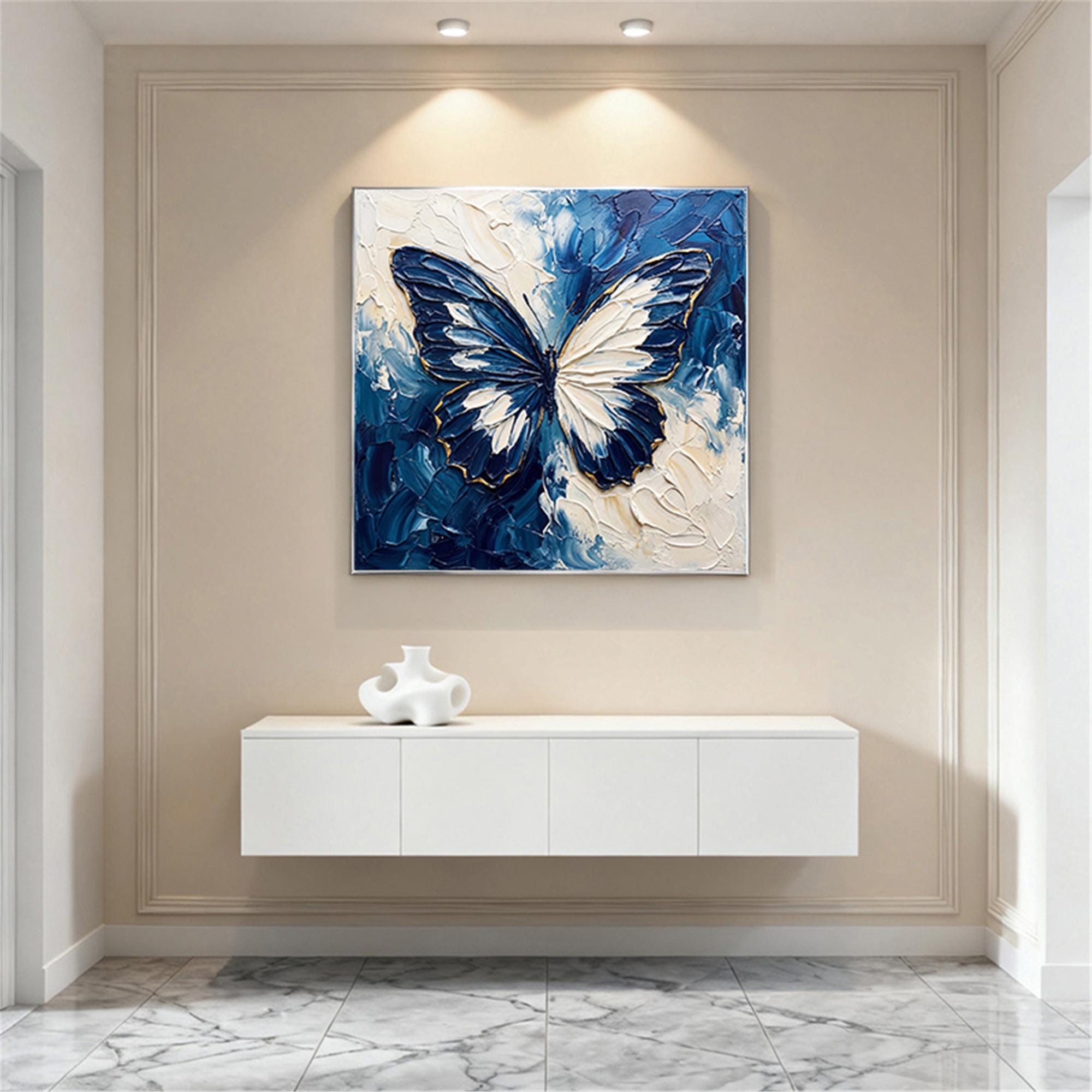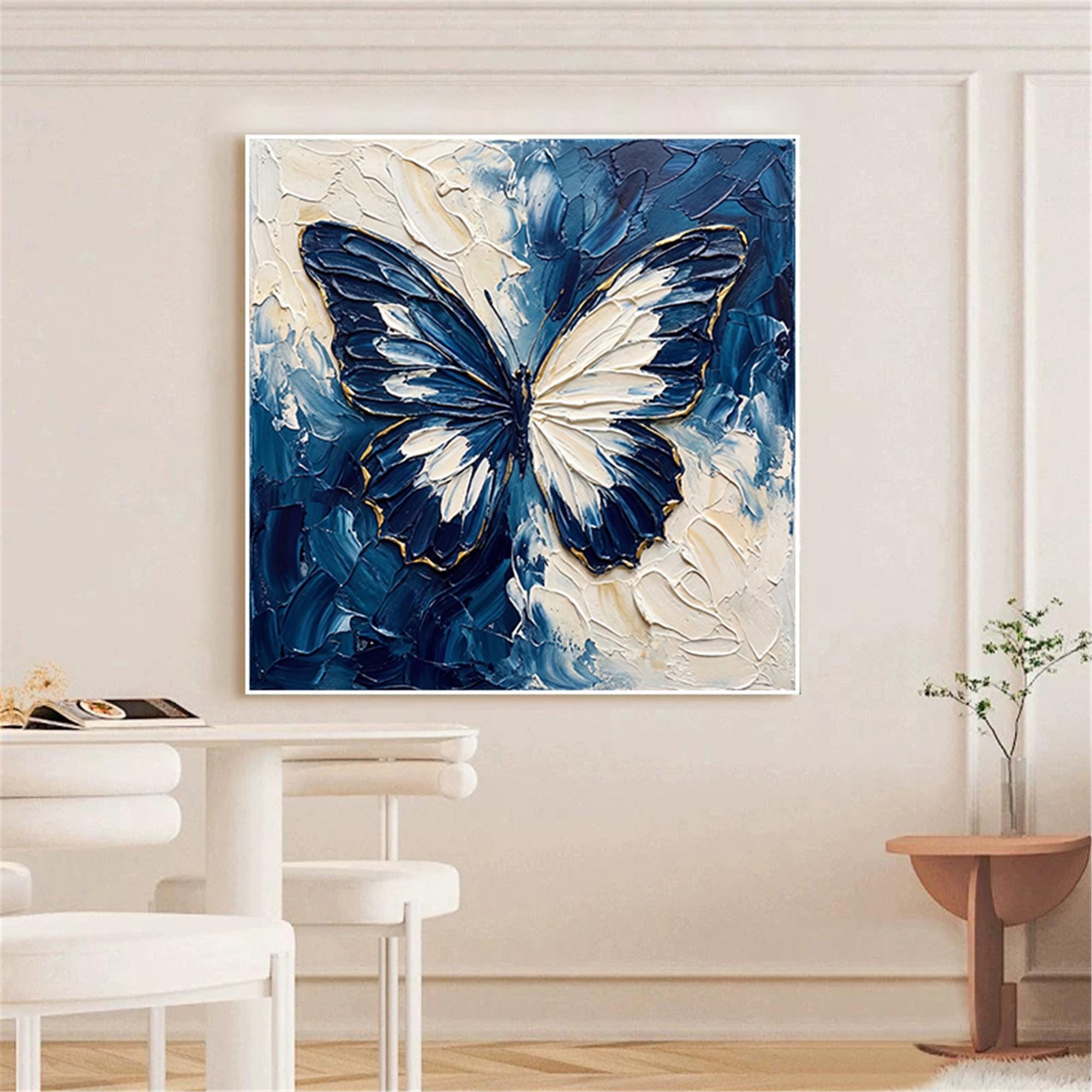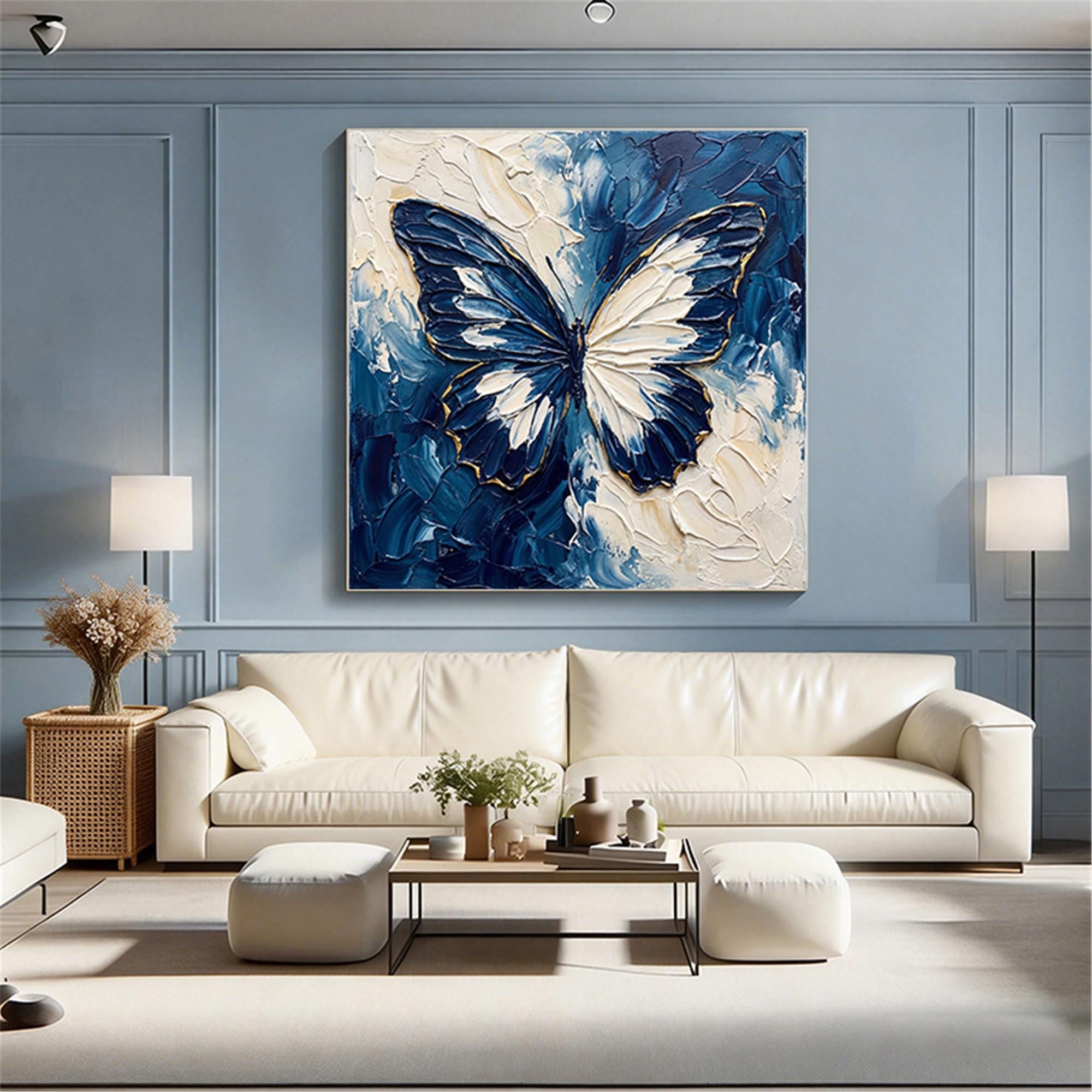 Blue Beige Butterfly Textured Wall Art,Abstract Neutral Canvas Painting,Large Living Room Artwork