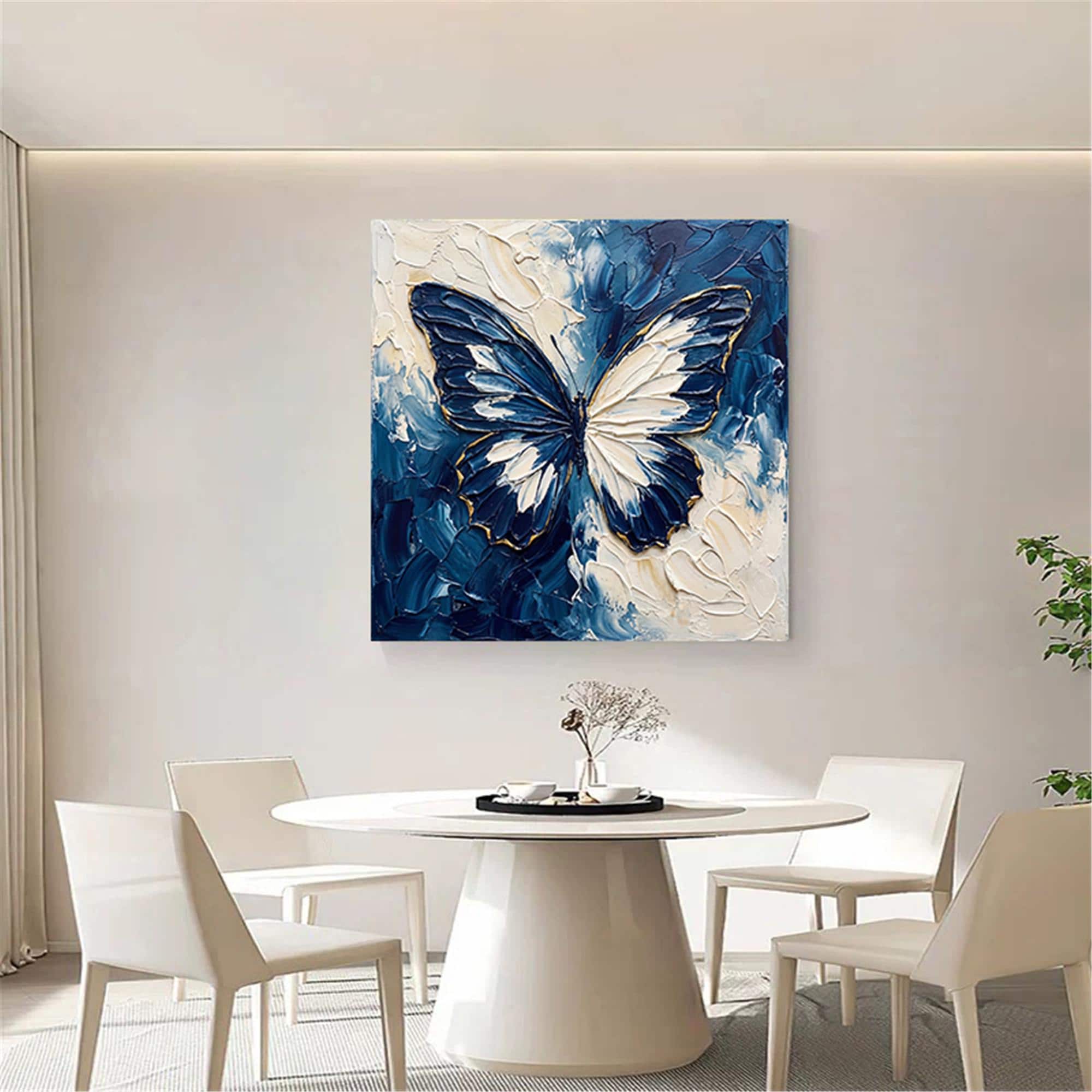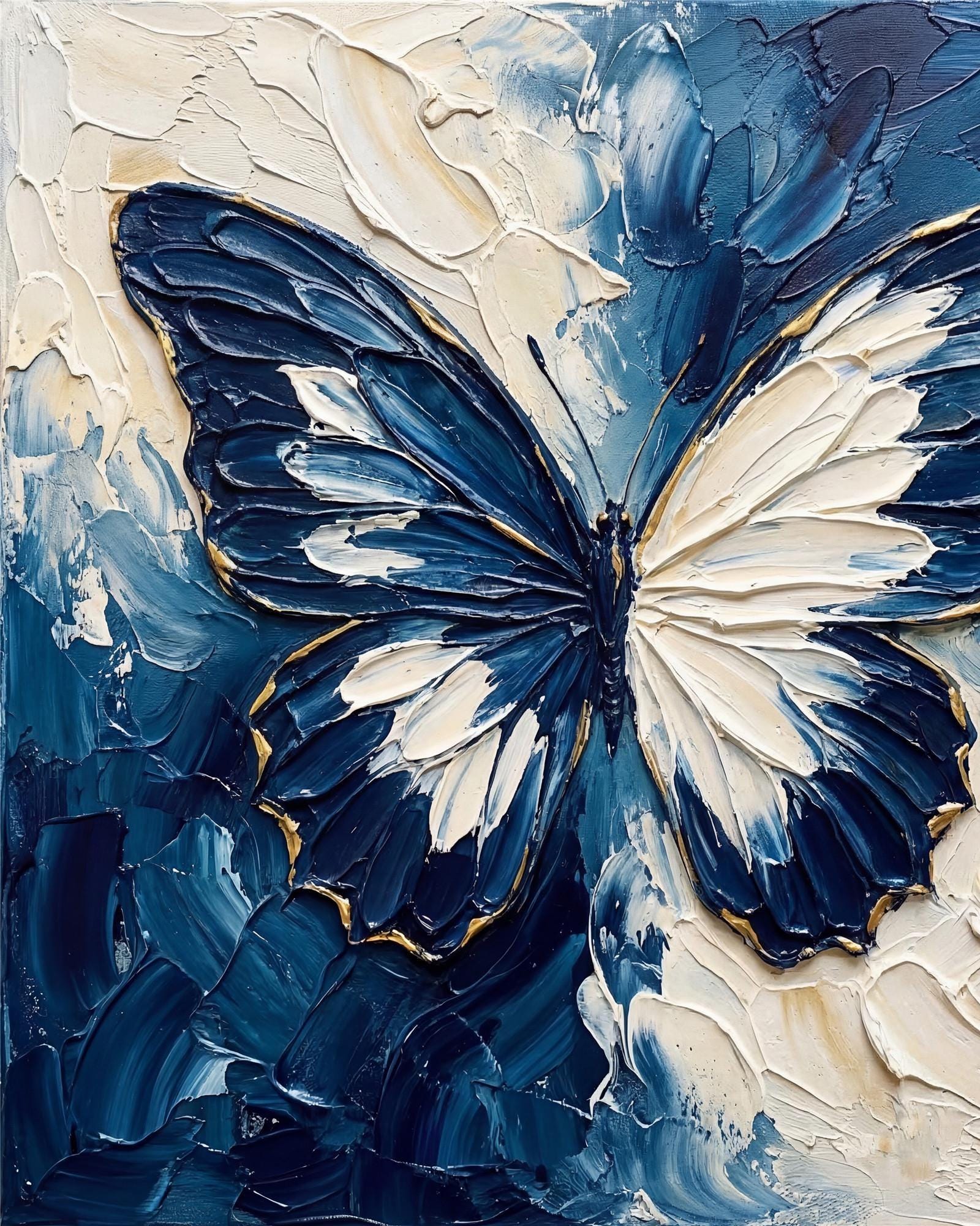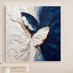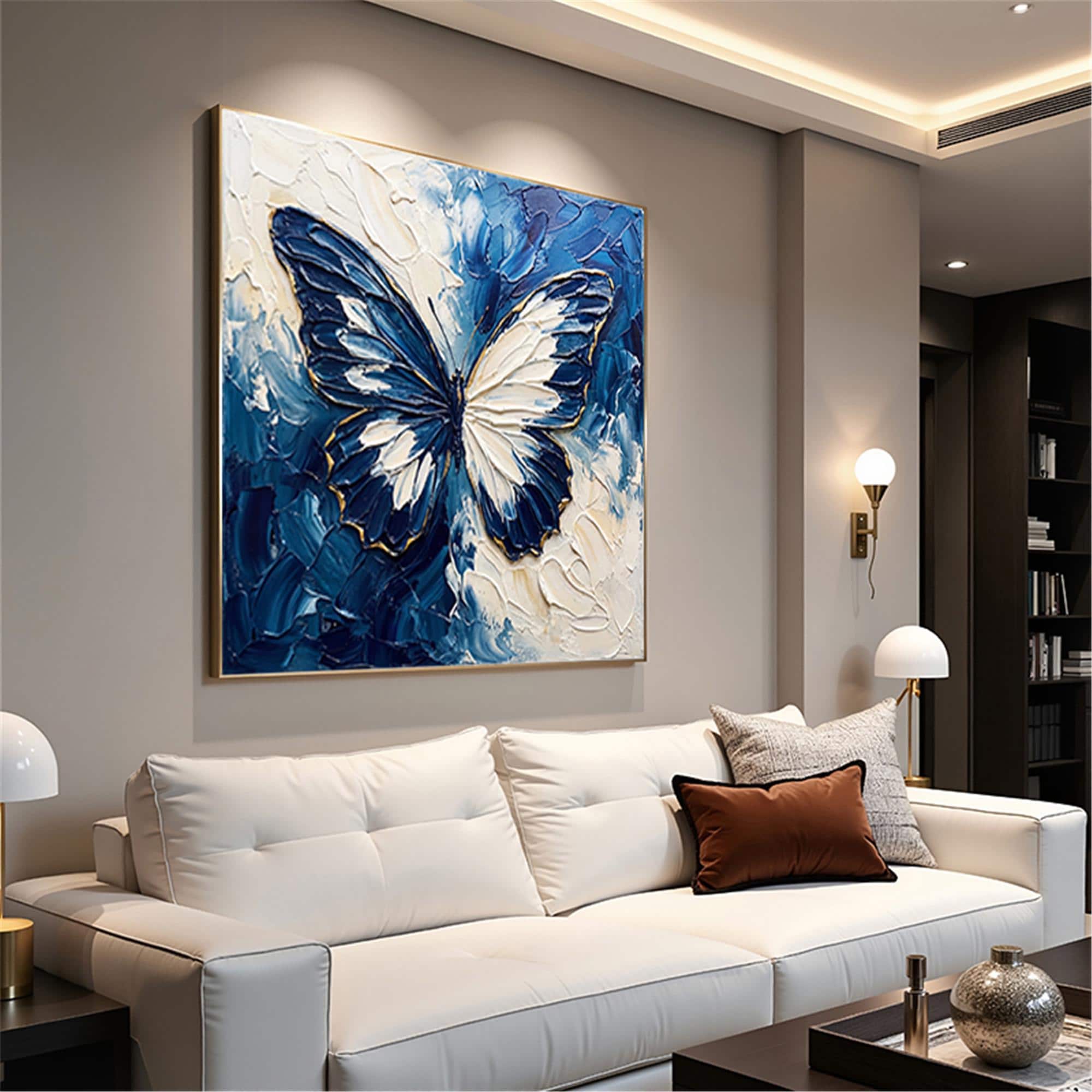 Blue Beige Butterfly Textured Wall Art,Abstract Neutral Canvas Painting,Large Living Room Artwork