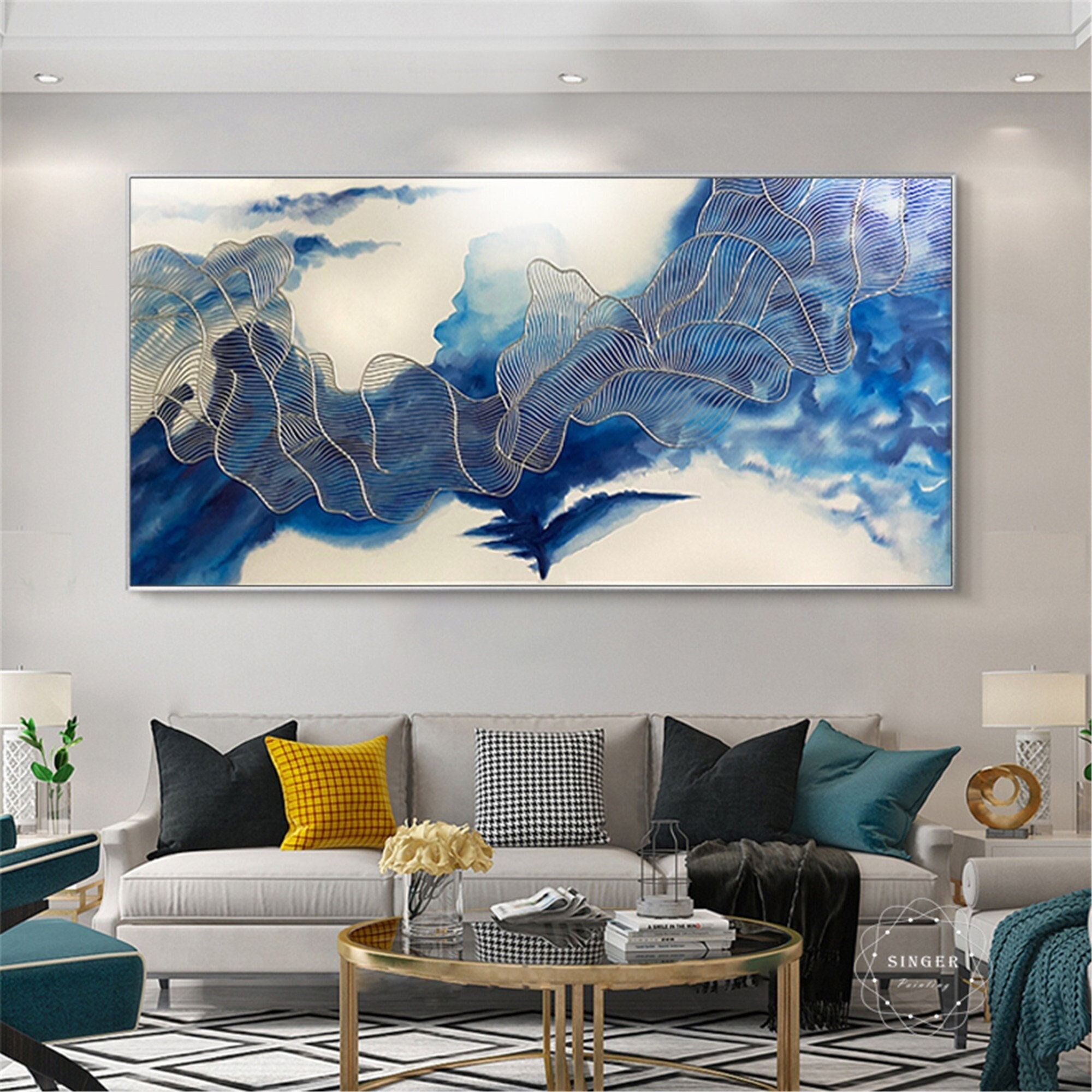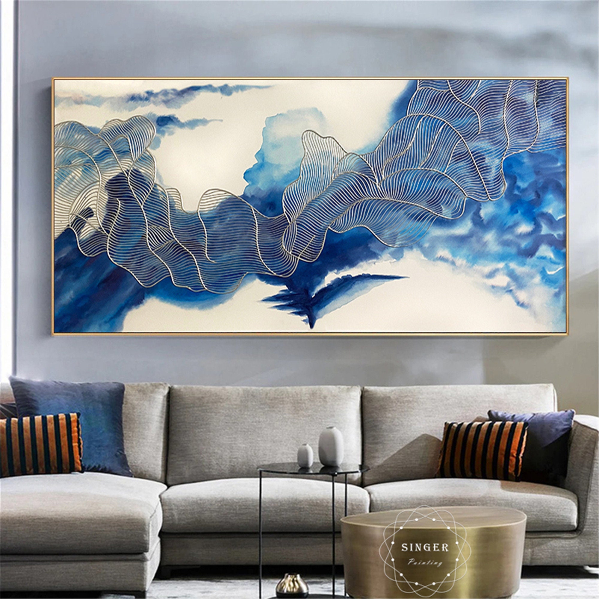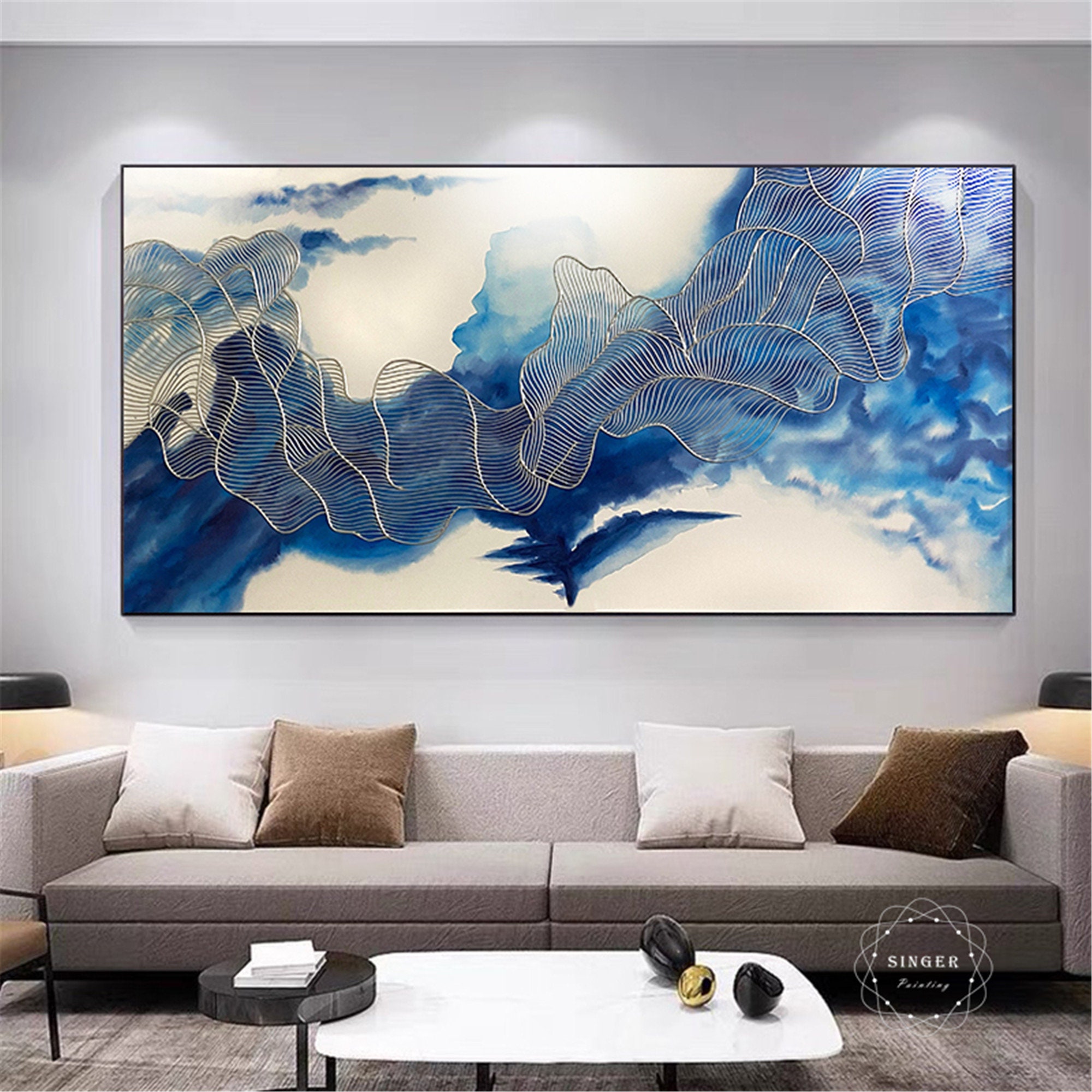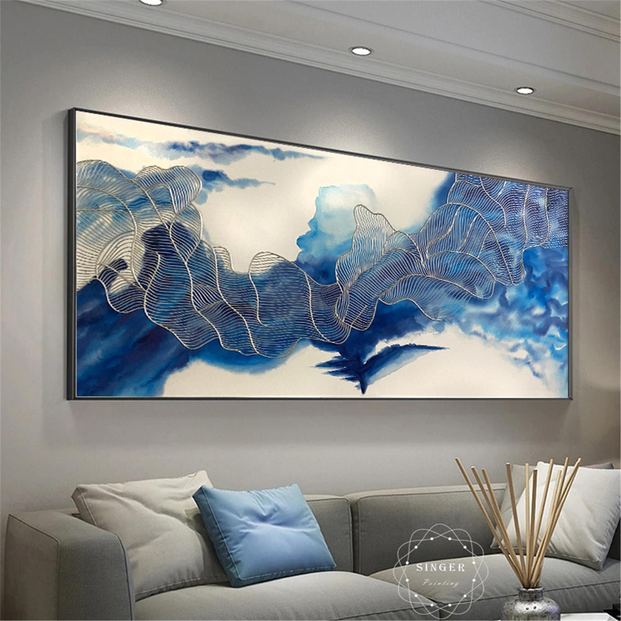 Silver Line Abstract Painting, Modern Blue Acrylic Artwork on Canvas wall decor office home